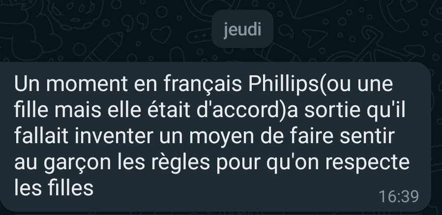 Alors j’ai entendu parler d’une masterclass qui c’est passé dans le clg louise weiss, une prof et un élève avait mis en évidence le fait qu’il fallait faire ressentir les règles aux garçons pour stopper la misogynie ! J’ai les copies de page écran